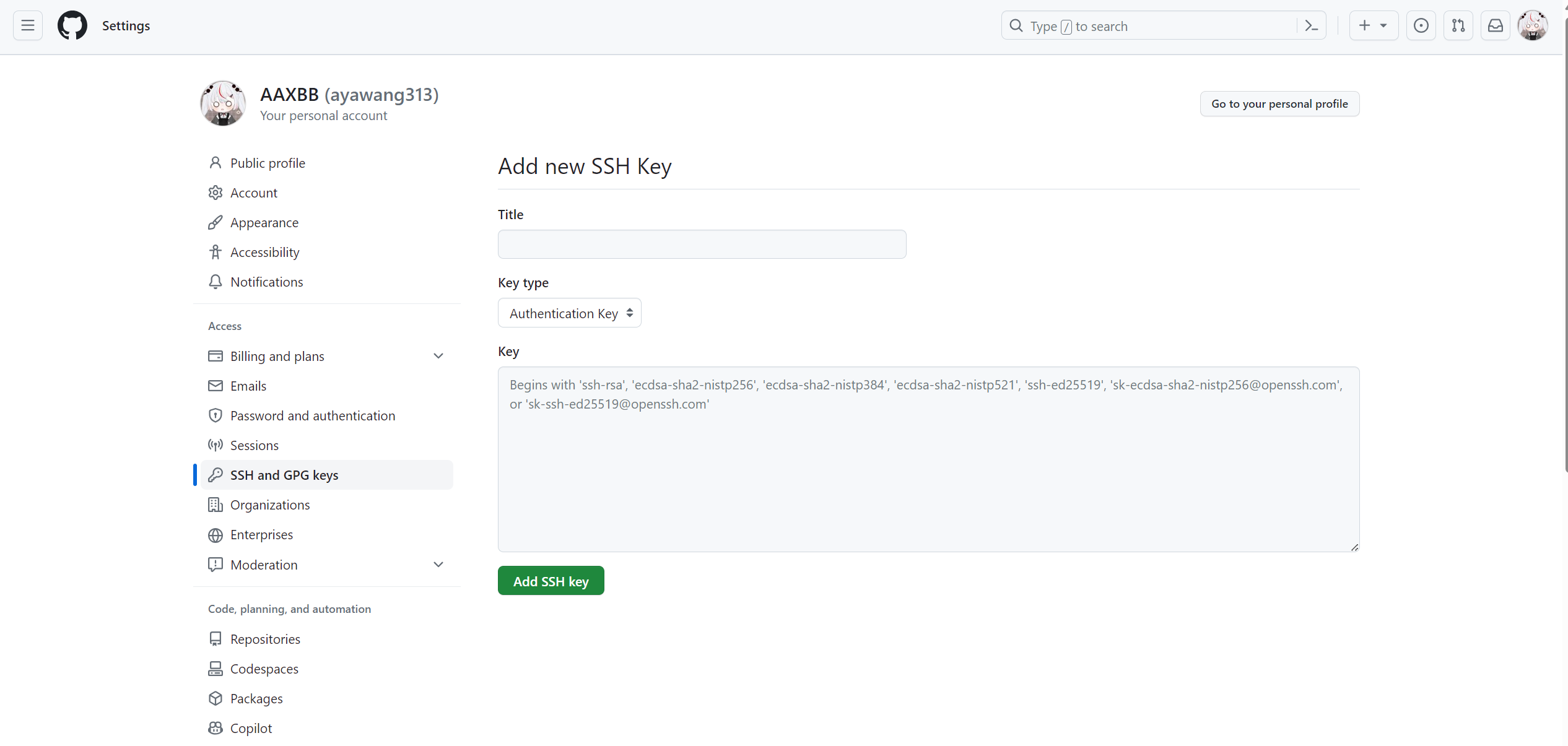 进入Github->Settings->SSH and GPG keys->New SSH key