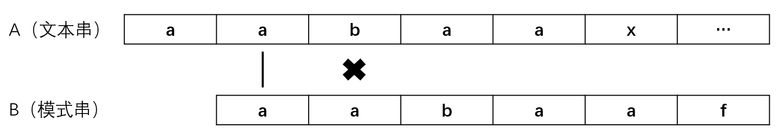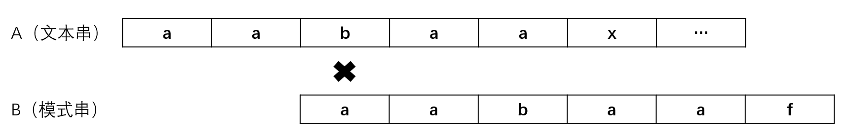 比如说,我们在第一次匹配完成后,发现模式串B中字符f与文本串A中字符x不匹配,按照朴素模式匹配算法,我们应当将模式串右移一位,继续进行单个字符的匹配,若仍有字符不匹配,则继续将模式串右移,直至匹配成功或遍历完字符串A仍未匹配成功。