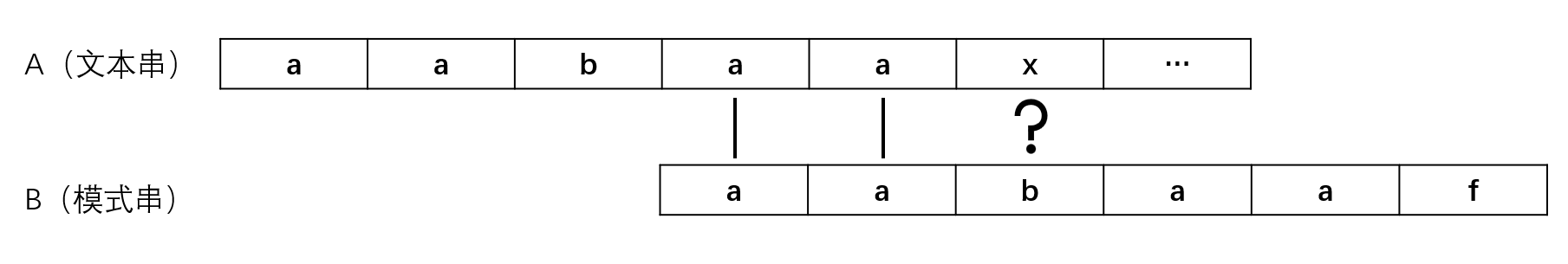 • 在第一次匹配时,前5个字符匹配成功,在字符串aabaa中,第一个字符a与与第三个字符b是不同的,这也就意味着我们在朴素模式匹配时,将模式串B右移2位进行匹配的操作是可以省略的,而第二个字符a与第一个字符a相同,但与第三个字符b是不同的,那么将模式串B右移1位进行匹配的操作也是可以省略的;